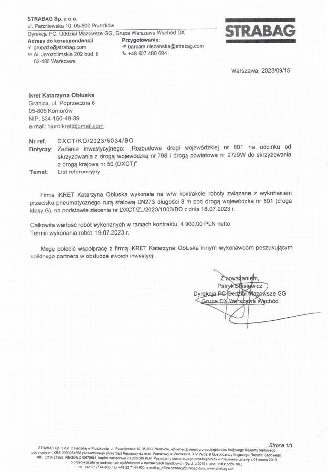 Firma iKret może pochwalić się wieloma pozytywnymi opiniami i referencjami od zadowolonych klientów z sektora publicznego i prywatnego. Nasze realizacje potwierdzają wysoką jakość usług bezwykopowych, takich jak przeciski kretem, pneumatyczne wbijanie rur stalowych oraz przeciski kretem